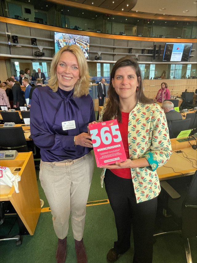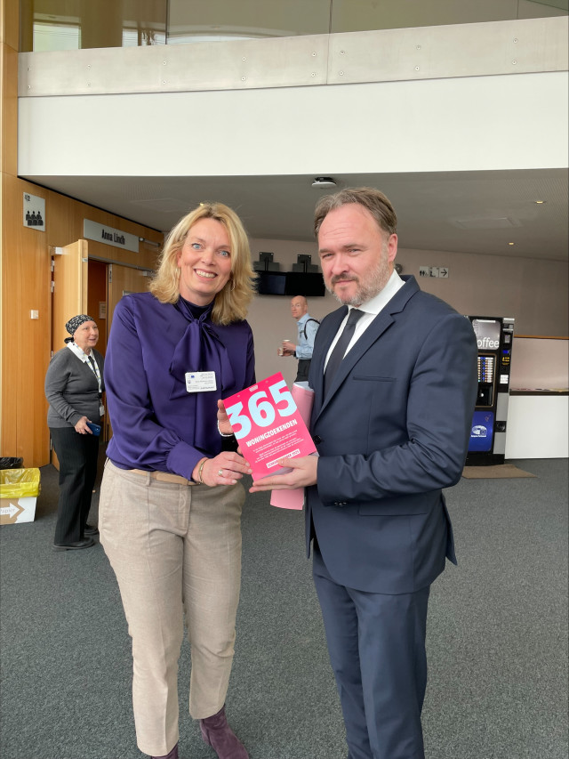 Tijdens haar bezoek overhandigde ze de scheurkalender aan Eurocommissaris van wonen Dan Jørgensen en Europarlementariër Brigitte van den Berg (D66/Renew), commissielid van de Special Committee on the Housing Crisis in the European Union.